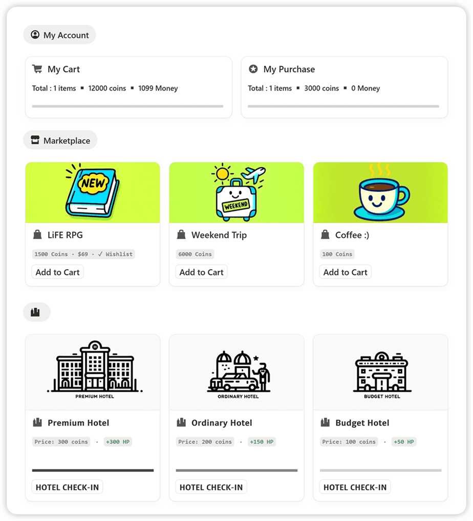 Spend coins in the Market, Hotel, or Black Market to gain real-life motivation boosts using gamification techniques.