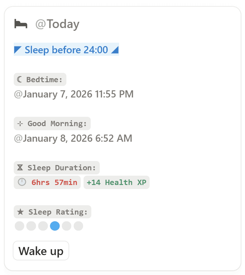 Track sleep duration and quality. Good sleep restores Health and improves your character’s performance.